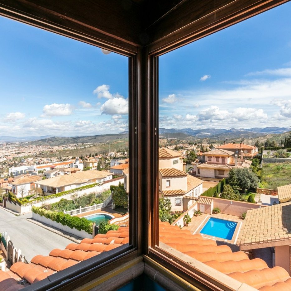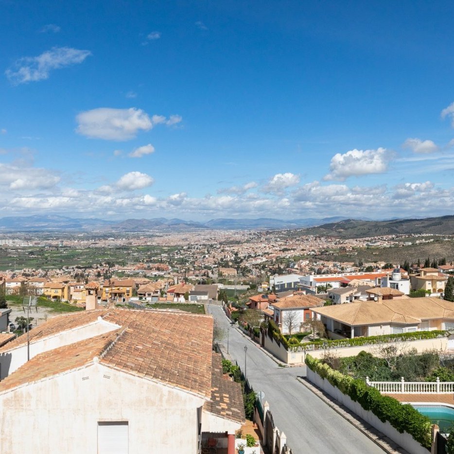 La casa se distribuye en un recibidor que incluye zona de comedor, salón y sala de estar, todo diáfano pero muy bien delimitado, dando paso también a la zona de día que tiene unas magníficas vistas de Granada y un aseo.